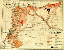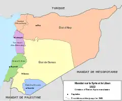C'est en septembre 1920 qu'est créé l'État du Grand Liban, appuyé sur les chrétiens maronites. La création d'un État côtier des Alaouites autour de Lattaquié et d'un État d'Alexandrette achève d'enclaver la Syrie. De plus, celle-ci est divisée entre un État de Damas et un État d'Alep, les Français jouant de la rivalité historique des deux villes. La naissance du Liban est vécue comme un échec par les Syriens. Jusqu'au XXe siècle, le mot « Liban » désigne la chaîne de montagnes parallèle à la côte qui sépare une partie du littoral de la plaine de Bekaa. Pour compléter ce morcellement sont séparés un État du djebel druze au sud et le plateau de la Djézireh, peuplé de Kurdes. Cela n'anéantit pas le nationalisme syrien, et la France doit livrer d'importants combats en 1925-1927, bombardant Damas en 1925 (environ 10 000 Syriens et 2 500 Français y laissent la vie)[19].