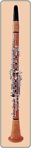 dans le bas du registre clairon) sont équipées de rouleaux à l'intérieur (comme sur les clarinettes Oehler). - 4. La clé de registre a généralement la même forme que sur les clarinettes allemandes, c'est-à-dire que le trou d'harmonie correspondant ne se trouve pas sur la face inférieure de la clarinette mais sur le côté gauche, ce qui nécessite une clé de forme montante au lieu d'une clé droite ; celle-ci peut être combinée avec une clé supplémentaire à ouverture et fermeture automatique pour améliorer la sonorité du si