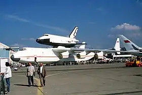 - Antonov An-225 Mriya : Cet avion de transport, le plus gros au monde, fut initialement développé pour transporter la navette Bourane, comme le Boeing 747 Shuttle Carrier Aircraft qui servit à transporter la navette spatiale américaine. Cet avion devait transporter sur son dos les 275 tonnes de l'étage spatial MAKS vers une position précise pour le lancement. Le lancement devait être réalisé à une altitude d'environ 8 800 m, après une succession de manœuvres de positionnement[1]. Le gain d'efficacité estimé par rapport à un lancement vertical depuis le sol était d'environ 270 m/s[1] ;