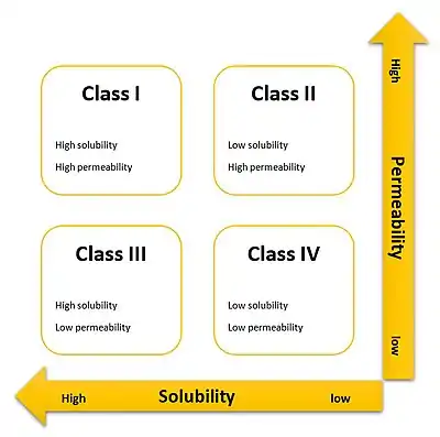 Selon le système de classification biopharmaceutique (BCS), les substances médicamenteuses sont classées en quatre classes selon leur solubilité et leur perméabilité[1] :