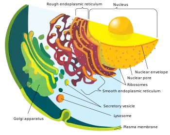 De nombreux types de cellules exportent des protéines produites par les ribosomes liés au réticulum endoplasmique rugueux. Les ribosomes réalisent la biosynthèse des protéines à partir des acides aminés et les protéines ainsi formées sont transférées à l'intérieur du réticulum endoplasmique pour y subir divers ajustements. Il peut s'agir de protéines transmembranaires, qui font partie intégrant de la membrane du réticulum endoplasmique, soit de protéines solubles dans l'eau, qui sont capables de traverser la membrane pour rejoindre la lumière du réticulum endoplasmique, où elles acquièrent leur structure tertiaire fonctionnelle. Des unités osidiques ou des polysaccharides peuvent être ajoutés, puis ces protéines sont transportées par le réticulum endoplasmique soit pour être sécrétées hors de la cellule, soit pour être traitées par l'appareil de Golgi[15],[17].