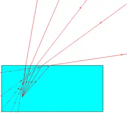 La figure ci-contre donne un exemple dans le cas d'un dioptre concave, où le milieu de réfraction (en bleu) est plus réfringent que le milieu d'incidence.