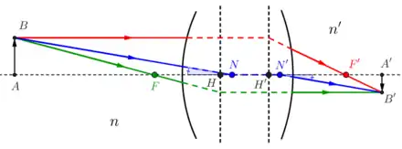 Un tel système est alors défini par ses éléments cardinaux - foyers et plans principaux, notamment, permettant de définir les distances focales et de construire les images.