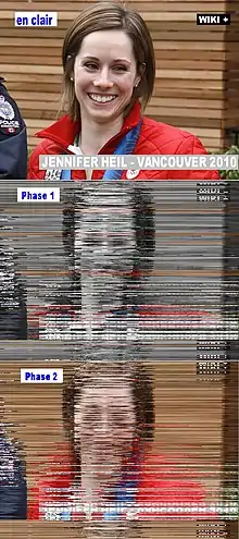 En France, le standard analogique sécam envoie alternativement les porteuses rouges et bleues. La chrominance est donc en demi-résolution la porteuse rouge est mise en mémoire et sera utilisée avec la porteuse bleue suivante et ainsi de suite. La table de permutation de la phase 1 ne respecte pas cette alternance : l'image est codée en noir et blanc et l'analyse des porteuses transmises de l'image codée permettent de déterminer la clef de 15 bit utilisée pour coder l'image.