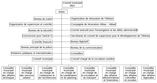 La municipalité de Téhéran (shahrdāri) est divisée en 22 arrondissements (mantagheh) municipaux, disposant chacun de son centre administratif. Les arrondissements sont numérotés pour être identifiés, comme sur le plan ci-contre. Téhéran est divisée en 112 quartiers (nāhiyeh) dont les principaux sont rappelés ci-après[13] :