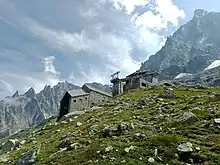 Ruines du chalet de Pierre Pointue au-dessus du glacier des Bossons.