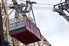 Le véhicule, suspendu au chariot, est généralement une cabine fermée (transport de voyageurs) mais peut également être une simple benne ouverte (transport de matériaux).