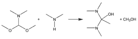 Enfin la dimérisation de la N,N,N',N',N",N"-hexaméthylméthanetriamine par chauffage fournit également le produit facilement, plus pratiquement et avec un bon rendement[6],[7] :