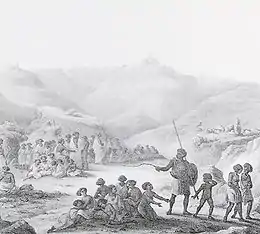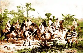 En , en pleine période de jeûne, Téwodros lance la conquête du Wello[27]. La campagne est particulièrement dure, en raison de la coalition formée par les sept clans wellos, habituellement en conflit[41]. En outre, la confrontation se poursuit durant la saison des pluies[Note 11]. Finalement, l'armée de Téwodros surmonte la forte résistance et à la suite de la prise de Meqdela le , l'expédition prend fin[27]. C'est sur ce point stratégique et symbolique dans la vie de Téwodros II[Note 12] que le negusse negest fait construire une forteresse devenue plus tard, le centre du gouvernement[27]. Afin d'empêcher une rébellion, Téwodros capture plusieurs chefs wellos vaincus[43] et les enferme à Meqdela, où il les détient comme otages[42].