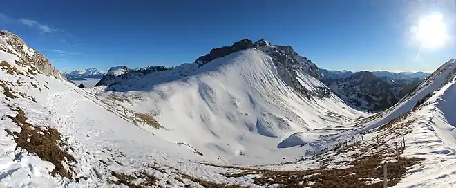 Vue depuis le pied de la dent du Lan au nord des Cornettes de Bise avec devant la tête de Lantsenaire ; à leurs pieds le col d'Ugeon (à gauche) et le marais d'Ugeon (à droite).