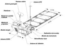 - le système Doppler Orbitography and Radiopositioning Integrated by Satellite (DORIS) est un nouvel équipement développé par le CNES, le Groupe de recherches en géodésie spatiale (GRGS), et l'Institut national de l'information géographique et forestière (IGN). Il repose sur un réseau de 50 stations situées à terre qui émettent en permanence sur deux longueurs d'onde (2 036,25 MHz et 401,25 MHz). Le récepteur embarqué à bord du satellite mesure l'effet Doppler subi par le signal, ce qui permet de déterminer la vitesse radiale entre la station émettrice et le satellite. Le système permet de mesurer la distance entre ces deux points avec une précision supérieure à 5 cm. L'instrument DORIS a une masse de 17 kg et consomme 20 watts.