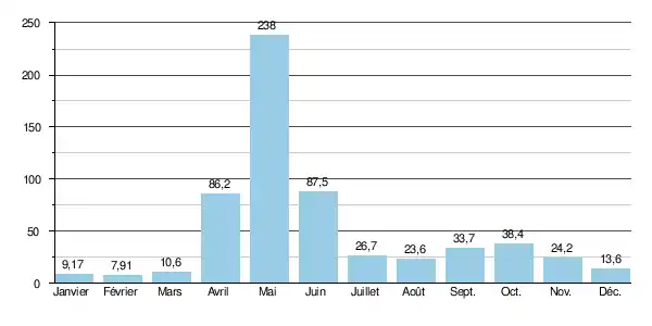 Le débit moyen mensuel observé en février (minimum d'étiage) est de 7,91 m3/s, soit plus ou moins de 3,5 % du débit moyen du mois de mai (238 m3/s), ce qui souligne l'amplitude très importante des variations saisonnières. Ces écarts de débit mensuel peuvent être plus marqués encore d'après les années : sur la durée d'observation de 52 ans, le débit mensuel minimal a été de 1,51 m3/s en , tandis que le débit mensuel maximal s'élevait à 350 m3/s en .