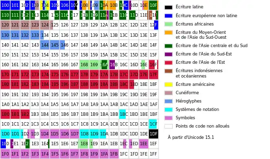 Les blocs affichés sur fond gris foncé ne sont pas encore attribués officiellement (dans la version actuelle Unicode 15.0). Parmi ceux-ci :