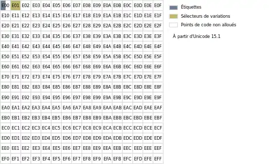 | U+E0000 | caractères étiquettes | — | ||||||||||||||