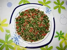 - le taboulé du Liban[2] et de Syrie[réf. nécessaire] est constitué surtout de persil très citronné, de très peu de boulghour fin et brun (blé complet), de tomates, de menthe fraîche et d'oignons. A certaines occasions peut être servi un taboulé plus suave assaisonné de sumac et de mélasse de grenade plutôt que de citron.