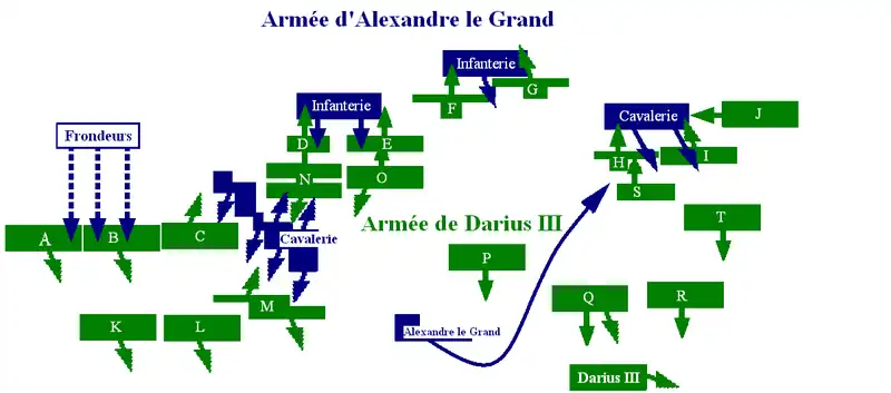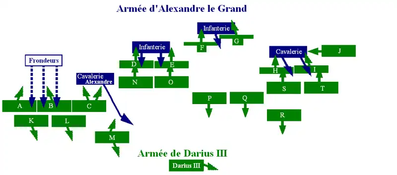 Afin de ne pas se faire encercler par l'innombrable cavalerie perse, Alexandre décide de disposer ses troupes en échelons. C'est un dispositif totalement innovant pour l'Antiquité. Alexandre prend la tête de la cavalerie des Compagnons sur l'aile droite, tandis que Darius III reste au centre, au milieu de ses troupes. Afin d'occuper le maximum de terrain, Alexandre décide de partir loin sur son flanc droit. Il s'avance au trot pour être suivi de près par ses bataillons de tirailleurs d'élite (hommes à pieds équipés de frondes ou de lances à courte portée) qu'il dispose en soutien. Il se débrouille ainsi pour masquer leur présence à la vue de l'armée perse. Les phalangites et les cavaliers thessaliens et thraces, qui tiennent l'aile gauche sous le commandement de Parménion, ont pour mission de maintenir le plus longtemps possible leurs positions.