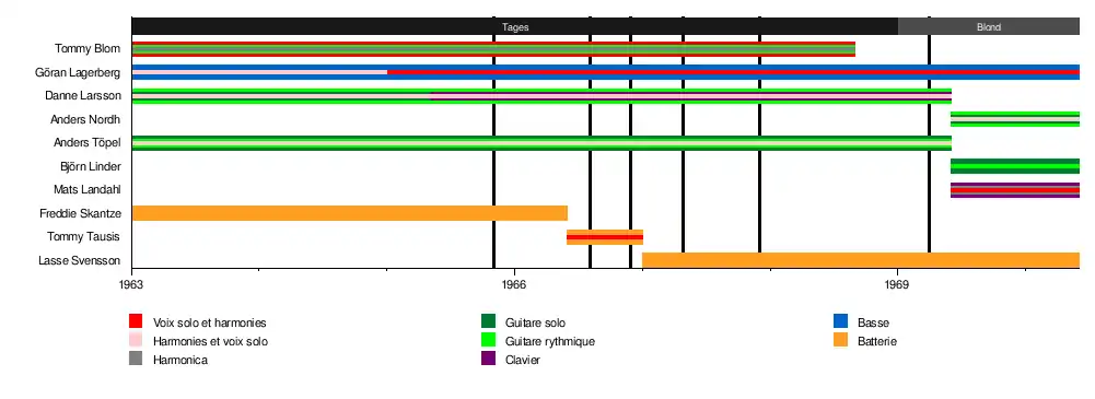 - Danne Larsson (né Dan Tage Larsson le à Göteborg) – chant, guitare rythmique, piano, orgue, spinet (1963-1969)