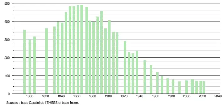 L'évolution du nombre d'habitants est connue à travers les recensements de la population effectués dans la commune depuis 1793. Pour les communes de moins de 10 000 habitants, une enquête de recensement portant sur toute la population est réalisée tous les cinq ans, les populations légales des années intermédiaires étant quant à elles estimées par interpolation ou extrapolation[17]. Pour la commune, le premier recensement exhaustif entrant dans le cadre du nouveau dispositif a été réalisé en 2007[18].