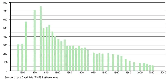L'évolution du nombre d'habitants est connue à travers les recensements de la population effectués dans la commune depuis 1793. Pour les communes de moins de 10 000 habitants, une enquête de recensement portant sur toute la population est réalisée tous les cinq ans, les populations légales des années intermédiaires étant quant à elles estimées par interpolation ou extrapolation[26]. Pour la commune, le premier recensement exhaustif entrant dans le cadre du nouveau dispositif a été réalisé en 2007[27].