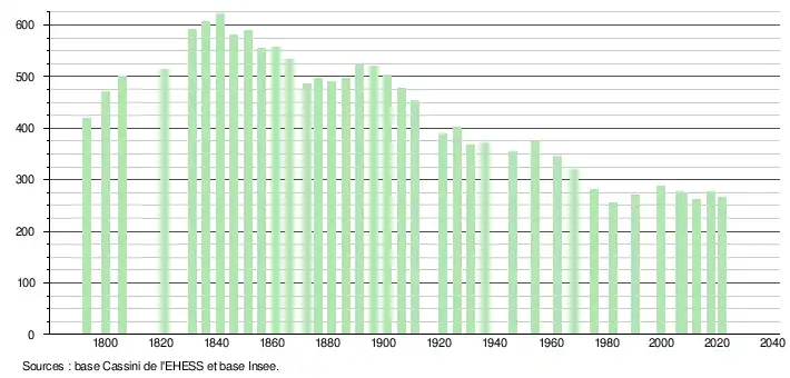 L'évolution du nombre d'habitants est connue à travers les recensements de la population effectués dans la commune depuis 1793. Pour les communes de moins de 10 000 habitants, une enquête de recensement portant sur toute la population est réalisée tous les cinq ans, les populations légales des années intermédiaires étant quant à elles estimées par interpolation ou extrapolation[23]. Pour la commune, le premier recensement exhaustif entrant dans le cadre du nouveau dispositif a été réalisé en 2007[24].