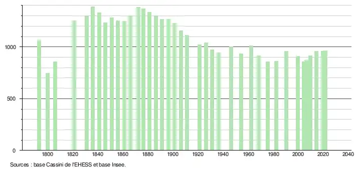 L'évolution du nombre d'habitants est connue à travers les recensements de la population effectués dans la commune depuis 1793. Pour les communes de moins de 10 000 habitants, une enquête de recensement portant sur toute la population est réalisée tous les cinq ans, les populations légales des années intermédiaires étant quant à elles estimées par interpolation ou extrapolation[24]. Pour la commune, le premier recensement exhaustif entrant dans le cadre du nouveau dispositif a été réalisé en 2004[25].