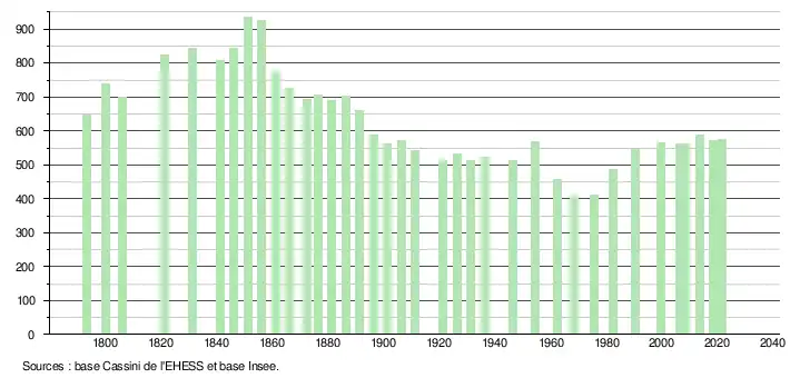 L'évolution du nombre d'habitants est connue à travers les recensements de la population effectués dans la commune depuis 1793. Pour les communes de moins de 10 000 habitants, une enquête de recensement portant sur toute la population est réalisée tous les cinq ans, les populations légales des années intermédiaires étant quant à elles estimées par interpolation ou extrapolation[38]. Pour la commune, le premier recensement exhaustif entrant dans le cadre du nouveau dispositif a été réalisé en 2008[39].