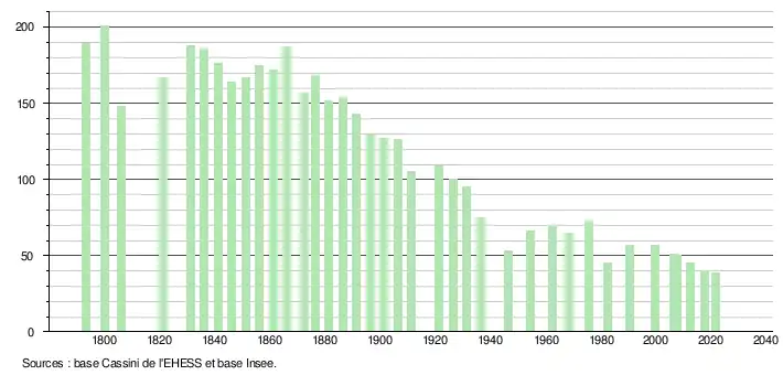 L'évolution du nombre d'habitants est connue à travers les recensements de la population effectués dans la commune depuis 1793. Pour les communes de moins de 10 000 habitants, une enquête de recensement portant sur toute la population est réalisée tous les cinq ans, les populations légales des années intermédiaires étant quant à elles estimées par interpolation ou extrapolation[18]. Pour la commune, le premier recensement exhaustif entrant dans le cadre du nouveau dispositif a été réalisé en 2007[19].