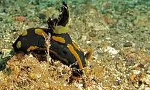 Le manteau est vert sombre et peut sembler noir chez certains spécimens. Cette face dorsale est parcourue de multiples lignes longitudinales et de taches jaune moutarde à orangées.