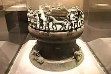 - Haut-relief : sur le pourtour du tympan ou descendant la base du tambour, ont pu être soudées des figurines en trois dimensions, batraciens surtout, mais aussi d'autres animaux ou de rares humains, parfois montés sur un cheval.