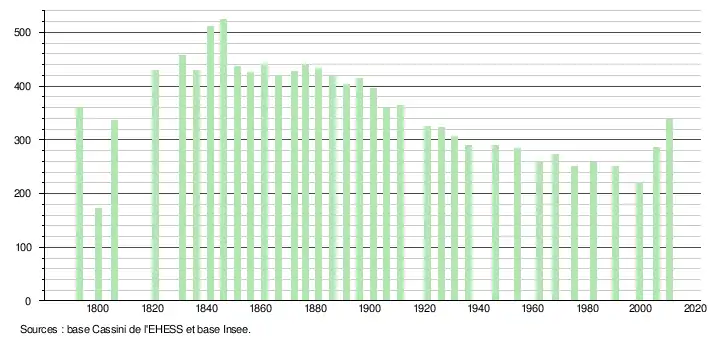 L'évolution du nombre d'habitants est connue à travers les recensements de la population effectués dans la commune depuis 1793. À partir du , les populations légales des communes sont publiées annuellement dans le cadre d'un recensement qui repose désormais sur une collecte d'information annuelle, concernant successivement tous les territoires communaux au cours d'une période de cinq ans. Pour les communes de moins de 10 000 habitants, une enquête de recensement portant sur toute la population est réalisée tous les cinq ans, les populations légales des années intermédiaires étant quant à elles estimées par interpolation ou extrapolation[28]. Pour la commune, le premier recensement exhaustif entrant dans le cadre du nouveau dispositif a été réalisé en 2005[29],[Note 1].
