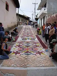 Antigua Guatemala est une autre région réputée pour ses tapis: elle associe des images catholiques et autochtones depuis la période coloniale[1]. Les tapis d'Antigua Guatemala sont généralement fabriqués à l'aide de moules à motifs allégoriques, symboles religieux, scènes bibliques, formes géométriques et motifs floraux, des familles entières travaillant ensemble à l'aide de sciure de bois, d'aiguilles de pin, de fruits, de fleurs, de sable et de papier découpé[1],[22]. Les tapis et les processions d'Antigua, au Guatemala, attirent environ 200 000 touristes du pays et de l'étranger[22].