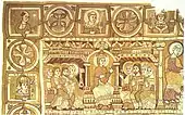 Jean Mabillon écrit pour l'année 1009 que le règlement de Cluny prévoit que les murs de l'abbatiale soient couverts de tapisserie les jours de grandes fêtes. Luc d'Achery a écrit dans les Miracles de saint Benoît que l'église abbatiale de Fleury était ornée de tentures en soie le jour de Pâques 1095. Dans la Vie de saint Gervin, abbé de Saint-Riquier, le même auteur écrit qu'il a fait exécuter des tapis très remarquables en 1060 pour l'église de son abbaye[15]. Vers 1050 est réalisée une tenture de Saint-Géron tissée dans la région de Cologne et reprenant un répertoire ornemental byzantin avec des griffons et des taureaux associés. On retrouve des figurations humaines dans les Tentures de la cathédrale d'Halberstadt, réalisée vers 1170, produites en Basse-Saxe, qui devaient être une tenture de chœur avec des représentations d'Abraham, saint Michel terrassant le dragon, du Christ et des apôtres. Un vestige plus récent montre Charlemagne entouré de philosophes[16].