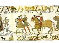 La tapisserie de Bayeux ou broderie de Bayeux[Note 1], successivement désignée « Telle du Conquest » (« toile de la Conquête ») par les chanoines de la cathédrale Notre-Dame de Bayeux, toilette de la Saint-Jean et toilette du duc Guillaume au XVIIIe siècle, ou encore tapisserie de la reine Mathilde au XIXe siècle, est une broderie (anciennement « tapisserie aux points d'aiguille ») du XIe siècle inscrite depuis 2007 au registre international Mémoire du monde par l'Unesco[2].