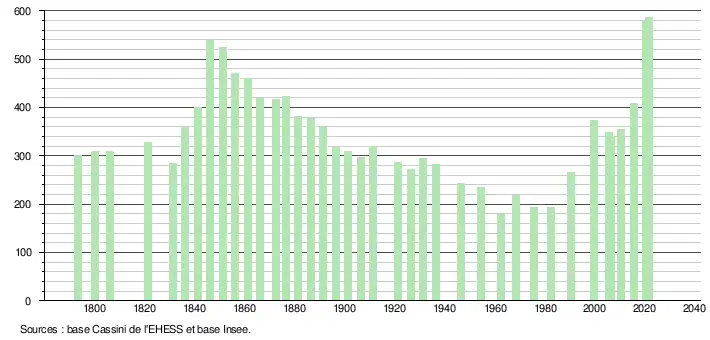 L'évolution du nombre d'habitants est connue à travers les recensements de la population effectués dans la commune depuis 1793. Pour les communes de moins de 10 000 habitants, une enquête de recensement portant sur toute la population est réalisée tous les cinq ans, les populations légales des années intermédiaires étant quant à elles estimées par interpolation ou extrapolation[31]. Pour la commune, le premier recensement exhaustif entrant dans le cadre du nouveau dispositif a été réalisé en 2005[32].