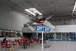 - L'aéroport international de Tarbes-Lourdes-Pyrénées[28] (code AITA : LDE • code OACI : LFBT). Situé à 10 km du centre de Tarbes, il comprend une grande aérogare principale sur deux niveaux et, à proximité de celle-ci, une aérogare de 500 m2 consacrée à l'aviation d'affaire et privée. L'aéroport est desservi par Volotea[29] qui assure deux liaisons aériennes par jour (semaine et week-end) avec Paris-Orly. Brussels Airlines assure, elle, deux vols hebdomadaires sur Bruxelles. Ryanair dessert Londres-Stansted (5 vols hebdomadaires), Milan (3 vols hebdomadaires), Cracovie, Rome (2 vols hebdo. chacune), et enfin Albastar[30] propose quant à elle 2 vols par semaine vers Rome, Naples et Palerme. L'aéroport propose également des vols charters saisonniers en provenance et à destination, principalement, des plus grandes villes européennes. L’aéroport a été géré de 2017 jusqu'à 2021 par le groupe EDEIS[31],[32]. Il est maintenant géré par la Société Publique Locale Aéroportuaire Régionale. L'aéroport est propriété de Pyrenia, un syndicat mixte composée du Conseil Régional Occitanie, du Conseil Départemental des Hautes-Pyrénées et de la Communauté d’Agglomération Tarbes Lourdes Pyrénées[33].