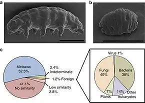 Longs de 0,1 à un peu plus de 1 mm, les tardigrades sont des animaux extrêmophiles, c'est-à-dire qu'ils peuvent survivre dans des environnements extrêmement hostiles (températures de −272 à +150 °C et pressions jusqu'à 6 000 bar[6], milieu anhydrique ou exposé aux rayonnements ultraviolets ou X, vide spatial[7]). Privés d'eau et de nourriture, ils se replient en cryptobiose, ce qui signifie que les processus métaboliques observables sont considérablement réduits : le tardigrade est alors en état de stase jusqu'à réactivation de ses processus métaboliques (sortie de stase). La stase peut durer une trentaine d’années[8].