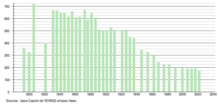 L'évolution du nombre d'habitants est connue à travers les recensements de la population effectués dans la commune depuis 1793. Pour les communes de moins de 10 000 habitants, une enquête de recensement portant sur toute la population est réalisée tous les cinq ans, les populations légales des années intermédiaires étant quant à elles estimées par interpolation ou extrapolation[43]. Pour la commune, le premier recensement exhaustif entrant dans le cadre du nouveau dispositif a été réalisé en 2006[44].