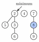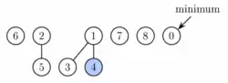 Finalement, l'opération supprimer peut être implémentée facilement en mettant la valeur de la clé de l'élément à supprimer à (la plus petite valeur représentable), de manière qu'elle devienne la plus petite valeur du tas entier. Il suffit alors d'appeler extraire minimum pour le supprimer. Le coût amorti de cette opération est O(log n).