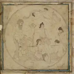 En haut, on remarque deux personnages volants conduits par un tissu rempli d’air. Ce sont les vents étésiens personnifiés, vents du nord qui soufflent dans la mer Méditerranée chaque année après le début de la canicule, et qui tempèrent la chaleur de l’été pendant quarante jours environ.