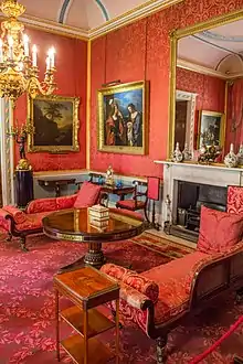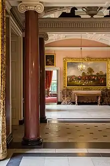 Le hall d'entrée est en trois travées. Il est décoré dans un style néoclassique avec un sol en marbre, des colonnes ioniques en porphyre rouge et un plafond géométrique à caissons et à voûte en tunnel. Le mobilier comprend deux commodes italiennes de la fin du XVIIe siècle et un coffre en noyer datant d'environ 1730, ainsi qu'une table et des chaises en noyer du XIXe siècle. De chaque côté d'une niche centrale se trouvent des bustes en marbre du duc de Wellington et de William Pitt le Jeune sur des colonnes. Le plus grand tableau du hall d'entrée est The Cheshire Hunt, 1839 d'Henry Calvert [5] [6]. À l'ouest du hall d'entrée se trouve la salle de cartes (où les cartes de visite étaient laissées - pas pour jouer aux cartes, comme dans d'autres salles de cartes). Cette pièce a une corniche néoclassique et une cheminée. Un ensemble de fauteuils ouverts sont anglais dans le style Adam qui datent d'environ 1785. D'autres meubles datent du XIXe siècle en marqueterie de style Louis XVI. Dans une vitrine se trouve un rare Abécédaire en filigrane d' argent. Les peintures de la salle comprennent La Gouvernante de Chardin, La Tête d'un vieil homme, 1639 d'Abraham Bloemaert, Un maréchal-ferrant de Philips Wouwerman et Tête de Nicodemus d'après Rogier van der Weyden [6].