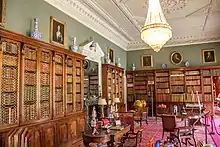 Derrière le portique sur la façade sud de la maison se trouve la bibliothèque. Le mobilier de cette pièce est pratique plutôt que décoratif, la plupart ayant été fabriqués par Gillows. Les bibliothèques datent de 1811-12. La paire de globes, terrestre et céleste, est fabriquée par la famille Cary. Au-dessus des bibliothèques se trouvent des vases et des bocaux hollandais de Delft des XVIIe et XVIIIe siècles. La salle contient plus de 8 000 livres, dont beaucoup dans leur couverture d'origine et en parfait état. Le premier livre est daté de 1513. Certains des livres ne sont pas reliés et dans leurs couvertures originales en papier, notamment les premières éditions de deux romans de Jane Austen. Hormis un portrait de Charles II, tous les tableaux de la bibliothèque sont des portraits de membres de la famille Egerton [6]. À l'ouest de la bibliothèque se trouve la salle à manger. Il s'agit d'une survivance de la maison d'origine et est décorée dans un style rococo conçu par Thomas Farnolls Pritchard. La cheminée en marbre blanc date de 1840 et est conçue par Richard Westmacott. La plupart des meubles de la pièce sont fabriqués en acajou par Gillows. Les peintures de la salle sont toutes des portraits de la famille Egerton [6].