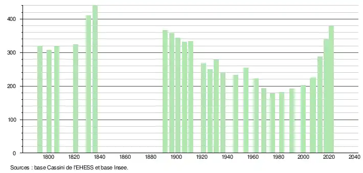 L'évolution du nombre d'habitants est connue à travers les recensements de la population effectués dans la commune depuis 1793. Pour les communes de moins de 10 000 habitants, une enquête de recensement portant sur toute la population est réalisée tous les cinq ans, les populations légales des années intermédiaires étant quant à elles estimées par interpolation ou extrapolation[29]. Pour la commune, le premier recensement exhaustif entrant dans le cadre du nouveau dispositif a été réalisé en 2007[30].