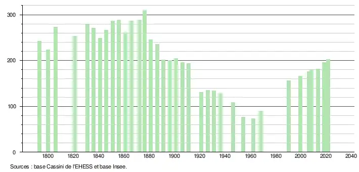 L'évolution du nombre d'habitants est connue à travers les recensements de la population effectués dans la commune depuis 1793. Pour les communes de moins de 10 000 habitants, une enquête de recensement portant sur toute la population est réalisée tous les cinq ans, les populations légales des années intermédiaires étant quant à elles estimées par interpolation ou extrapolation[18]. Pour la commune, le premier recensement exhaustif entrant dans le cadre du nouveau dispositif a été réalisé en 2008[19].