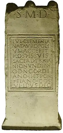 - le ou les récipiendaires du sacrifice, personne privée (généralement commanditaire pour elle-même), personnalités (empereur, famille impériale) ;