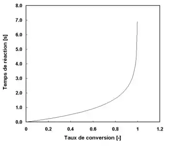 En choisissant arbitrairement une constante de vitesse hypothétique de 1 on peut obtenir la courbe montrée en figure 1 qui donne le temps de réaction nécessaire pour obtenir un taux de conversion donné.