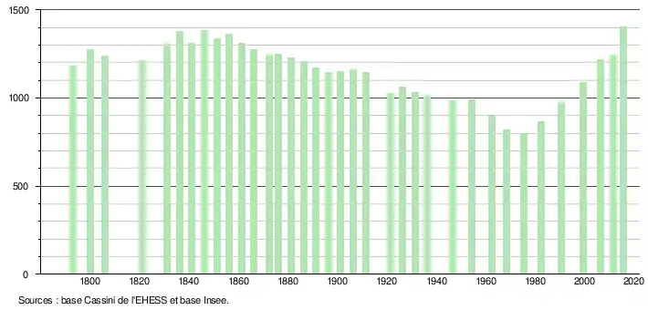 L'évolution du nombre d'habitants est connue à travers les recensements de la population effectués dans la commune depuis 1793. Pour les communes de moins de 10 000 habitants, une enquête de recensement portant sur toute la population est réalisée tous les cinq ans, les populations légales des années intermédiaires étant quant à elles estimées par interpolation ou extrapolation[3]. Pour la commune, le premier recensement exhaustif entrant dans le cadre du nouveau dispositif a été réalisé en 2006[4].