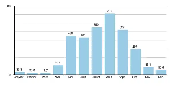 Le débit moyen mensuel observé en mars (minimum d'étiage) est de 17,7 m3/s, soit à peine 2,5 % du débit moyen du mois d'août (713 m3/s), ce qui témoigne de la grande amplitude des variations saisonnières. Sur la durée d'observation de 59 ans, le débit mensuel minimal a été de 2,45 m3/s en , tandis que le débit mensuel maximal s'élevait à 1 710 m3/s en juin de la même année.