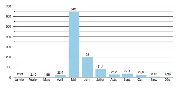 Le débit moyen mensuel observé en mars (minimum d'étiage) est de 1,88 m3/s, soit à peine 0,3 % du débit moyen du mois de mai (642 m3/s), ce qui montre des variations saisonnières d'amplitude extrême, comme la plupart des cours d'eau du bassin de la Léna. Ces écarts de débit mensuel peuvent être plus marqués encore d'après les années : sur la durée d'observation de 25 ans, le débit mensuel minimal a été de 0,50 m3/s en , tandis que le débit mensuel maximal s'élevait à 908 m3/s en .