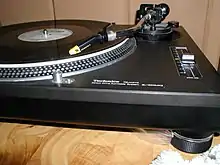 - Fort couple (0,15 N m), signifiant que le plateau tournera à la vitesse désirée immédiatement (0,7 s pour atteindre les 33 ⅓ tr/min) depuis la position d'arrêt) et aussi qu'il faut un appui assez fort sur le plateau pour l'arrêter.