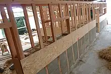 - Les coffrages : d'une dimension supérieure à la botte de paille, les coffrages sont des planches de bois reconstitué de type OSB ou contreplaqué, fixées de chaque côté de la paroi et permettant le coulage du mortier de part et d'autre de la botte de paille entre chaque paire de montants.